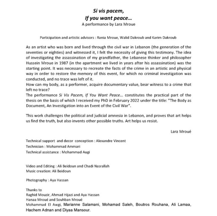 Suite à la résidence artistique à La Bazooka au Havre et à Hammana Artiste House au Liban en 2021, la performance a été présentée à Zoukak Théâtre au Liban le 18 et 19 Février 2023 après une résidence artistique d’une semaine.